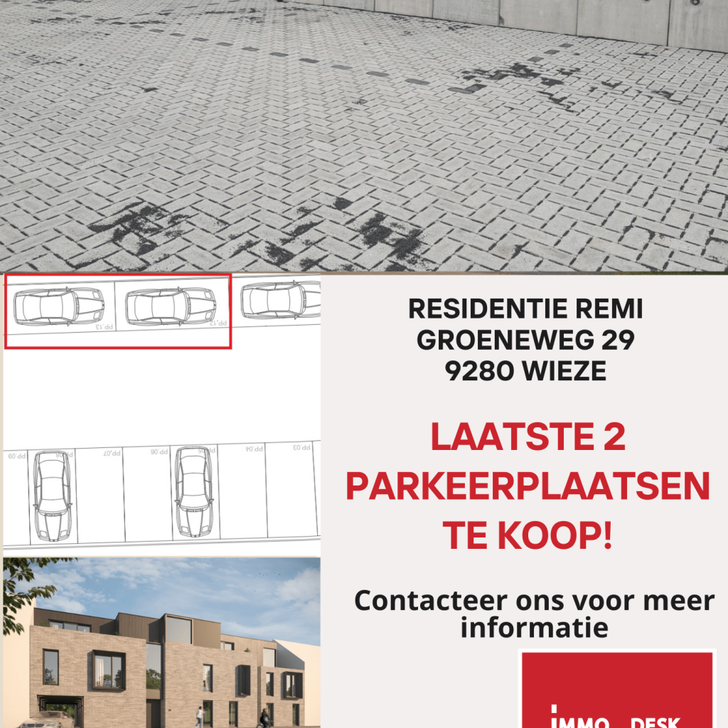 Deze buitenstaanplaatsen (Parking nummer 12 en nummer 13) bevinden zich op de Groeneweg 29 in Wieze, naast ‘Residentie Remi’.
